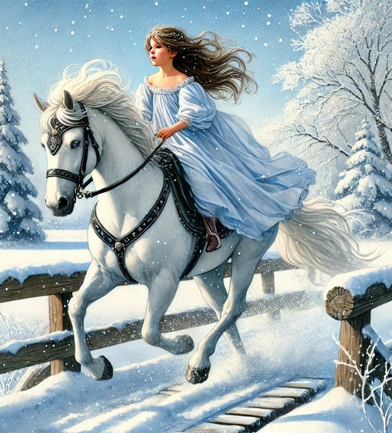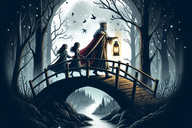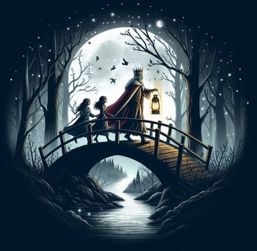Isabella, Esmerelda, and the king cross the bridge in order to visit the woodworker in the magical forest behind the castle.