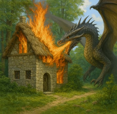 The dragon attacks Edwyn's Southern House (illustration not in the book).