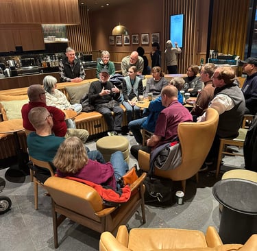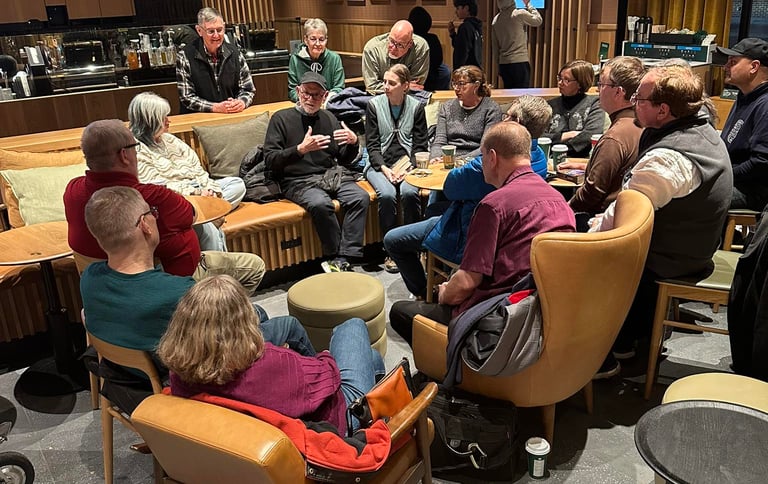 On a very cold evening, Christine and I attended Stephen R. Lawhead's gathering with readers at the downtown Starbucks in Wheaton last night (we're in the lower left corner of the photo). I was looking for a little info and inspiration for my own fantasy writing and got both.